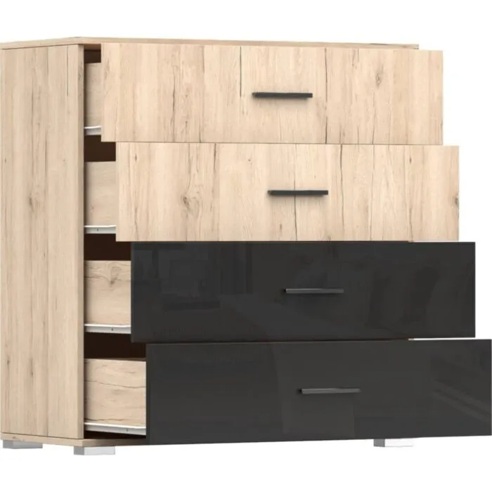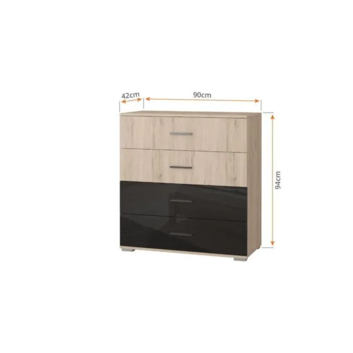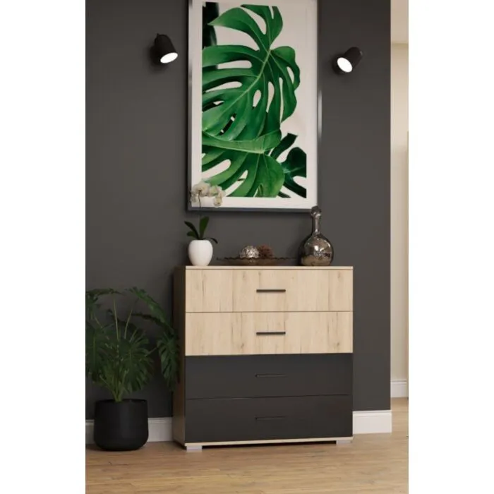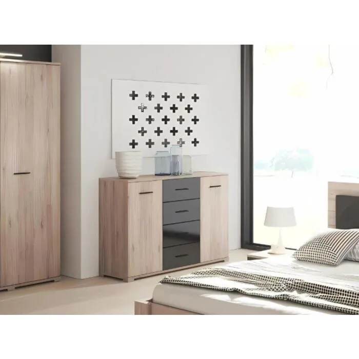 Komoda DULE je primerna za vsako spalnico. Narejena je iz kvalitetne laminirane plošče in ima ABS robove. Vsebuje 4 predale.