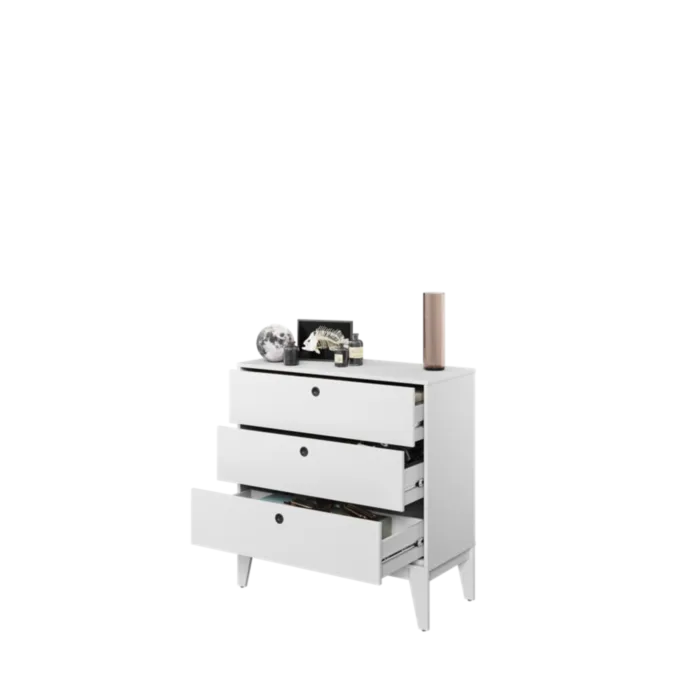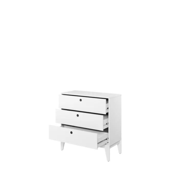 Komoda FAMA 2 je narejena iz kvalitetne laminirane plošče s ABS robovi. Dobavljiva je v beli mat barvi s črnimi ročaji. Odlično se kombinira s ostalimi izdelki iz kolekcije FAMA.