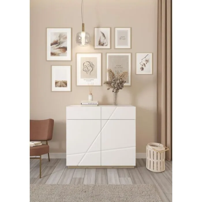 Komoda FURY je široka komoda, primerna za vsako dnevno sobo. Ima moderne linije, a hkrati eleganten izgled. Korpus je u kombinaciji bele in hrast barve. Odpira se s mehanizmom “PUSH TO OPEN”.