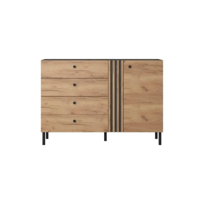 Komoda GALIJA vas bo očarala s svojimi toplimi barvami skandinavskega hrasta v kombinaciji s kontrastno antracit barvo, ki bodo vašo spalnico naredile prostor blizu narave. Komoda GALIJA je narejena iz kvalitetne laminirane plošče z ABS robovi ter ima črno/zlate ročaje.