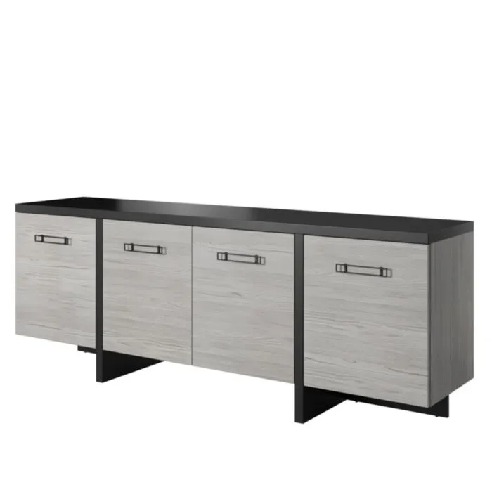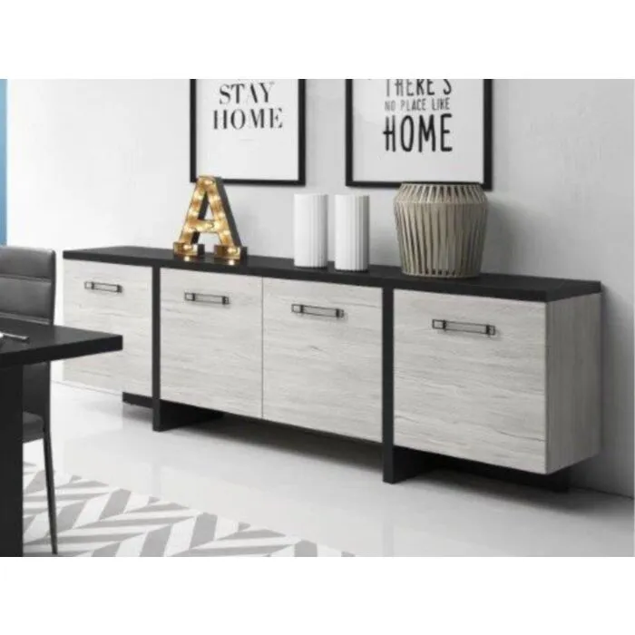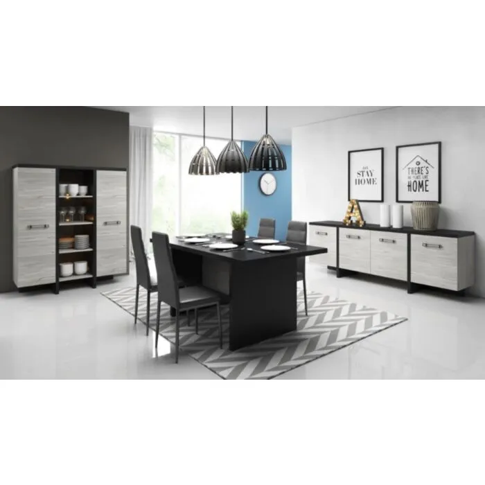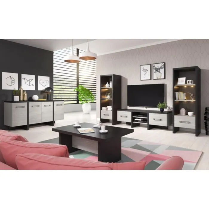 Komoda  LEON je zelo eleganten in stabilen. Primeren je za vsako dnevno sobo. Korpus regala ja v barvi črnega bora, fronta regala pa je v barvi beljenega hrasta. Noge regala so plastične. Narejen je iz laminirane plošče debeline 16 mm z ABS robovi.