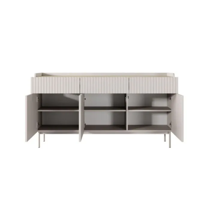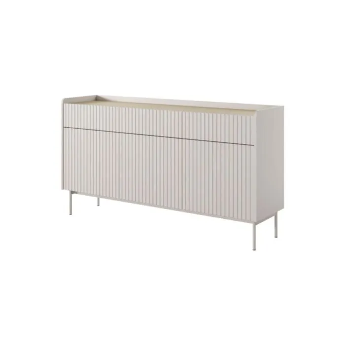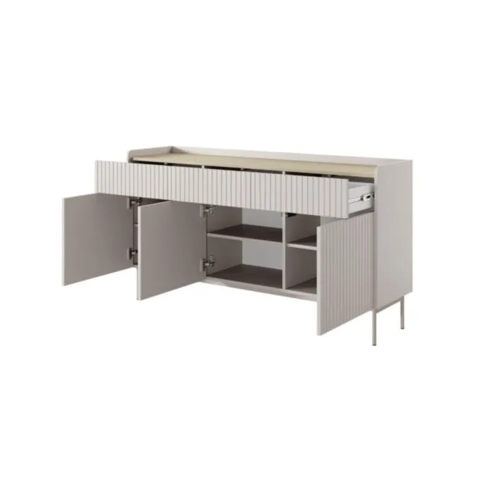 Komoda LEVAS, je eleganten kos pohištva, ki popestri vaš prostor s svojim luksuznim dizajnom. Narejen je iz kakovostnih materialov v bež barvi s kombinacijo hrast. Izdelan je iz MDF-ja in ABS robov. Ima bež kovinske noge in mehko odpiranje. Ima rebrast dizajn, kar da posebno eleganco.
