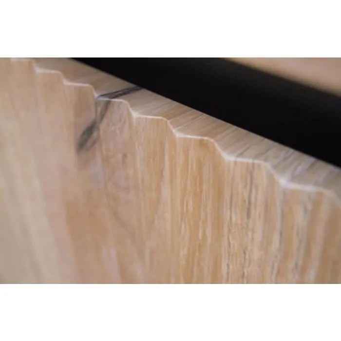 Robovi so obdelani z ABS materialom, kar povečuje odpornost na obrabo in podaljšuje življenjsko dobo pohištva. Fronte so iz MDF plošč debeline 16 mm in prav tako v hrast barvi, kar dodaja eleganco in sodoben pridih. Komoda MILI se ponaša z elegantnimi nogicami v črni metal barvi, katerih višina znaša 15 cm.