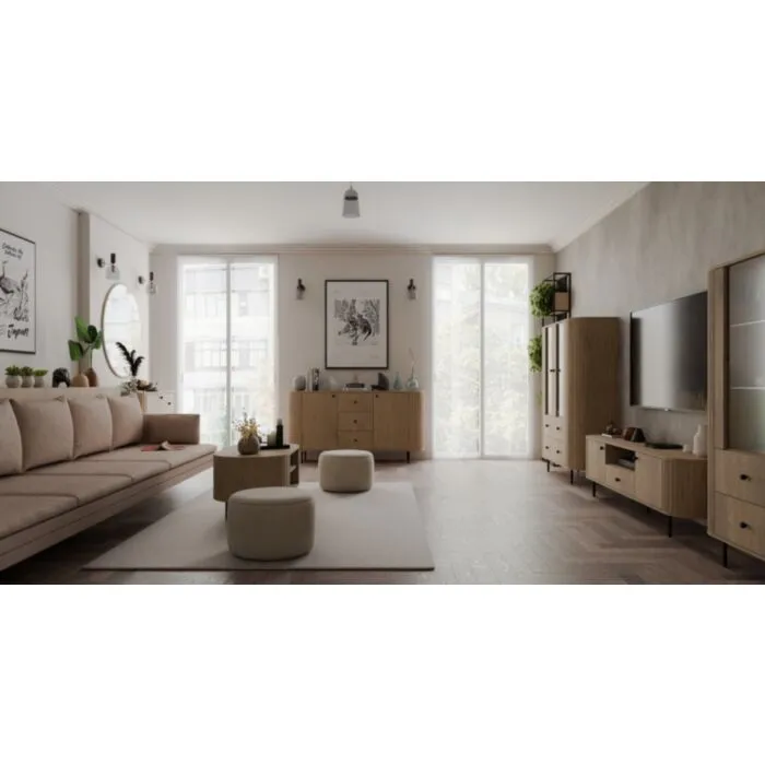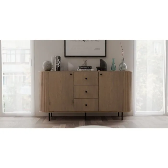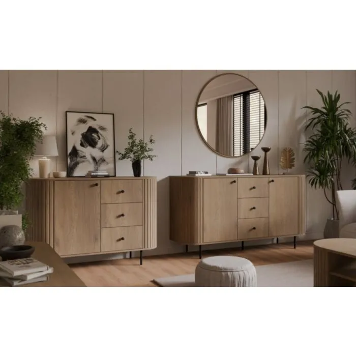Komoda OVARI hrast je zaradi svoje oblike in visokokakovostnih materialov trpežna in vzdržljiva. Odporna je na praske, udarce in obrabo. Je enostavna za vzdrževanje, saj je površina preprosta za čiščenje in negovanje. Estetsko se poda v vsak prostor ter ima dobro odpornost na madeže in vlago. Dobavljiva je v hrast barvi. Na levi in desni strani ima vrata v notranjosti pa sta dva prostorna prostora za shranjevanje. Na sredini ima tri predale, kar dodatno pripomore k njeni funkcionalnosti.