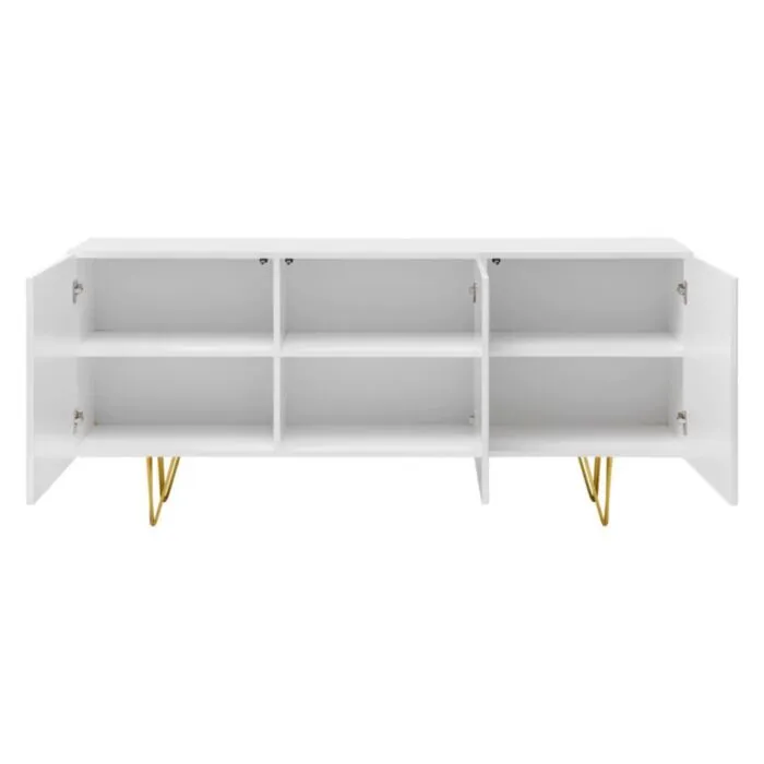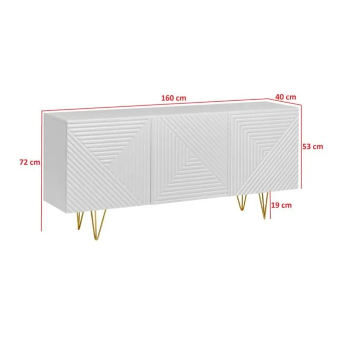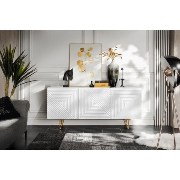 Komoda PIRAMIDA je moderno oblikovana in elegantnega videza, brez ročajev. Sistem odpiranja push to open tihega zapiranja. V beli mat barvi z zlatimi metalnimi nogicami. Izdelana v EU iz laminirane plošče debeline 16mm in ABS robovi.