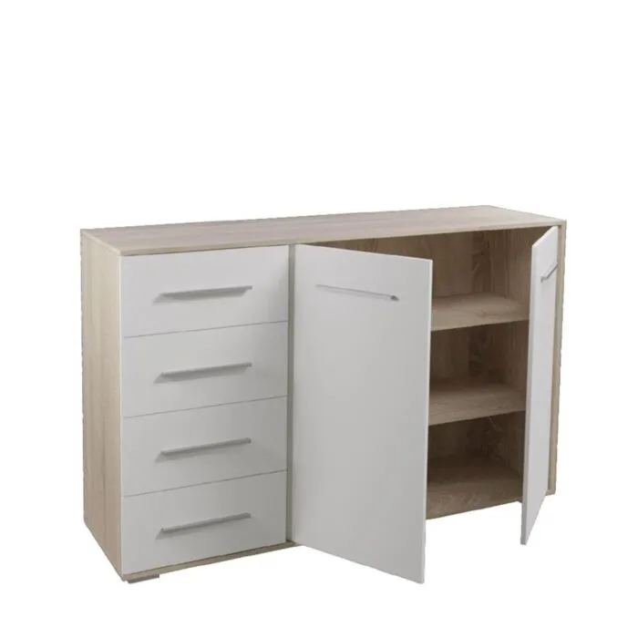 Komoda RITA 2 je primerna za vsak prostor. Noge in ročaji  so plastični. Regal je narejen iz laminirane plošče debeline 16 mm z ABS robovi.