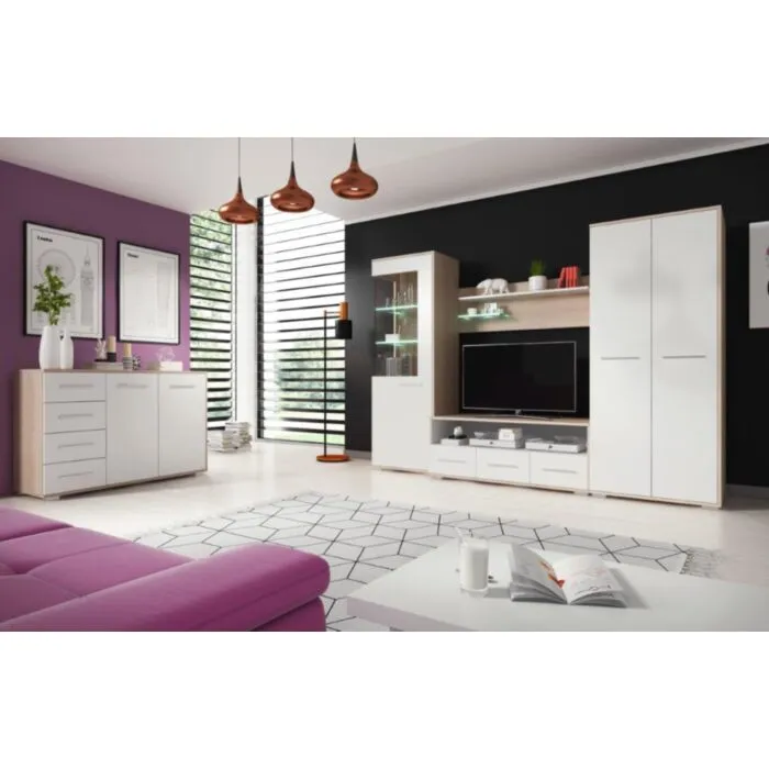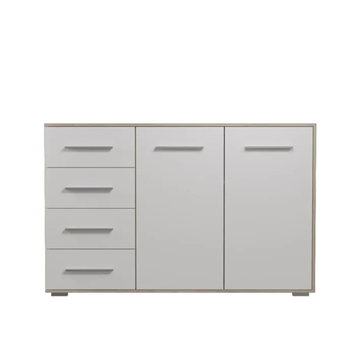 Komoda RITA je primerna za vsak prostor. Korpus je v barvi hrast sonoma, fronta je v beli barvi mat .Noge in ročaji  so plastični. Regal je narejen iz laminirane plošče debeline 16 mm z ABS robovi.