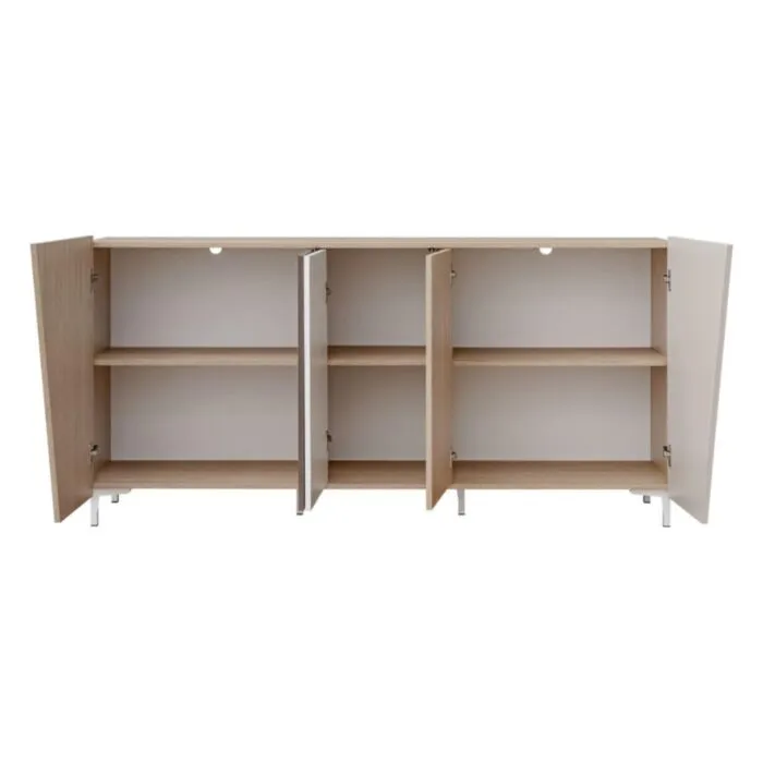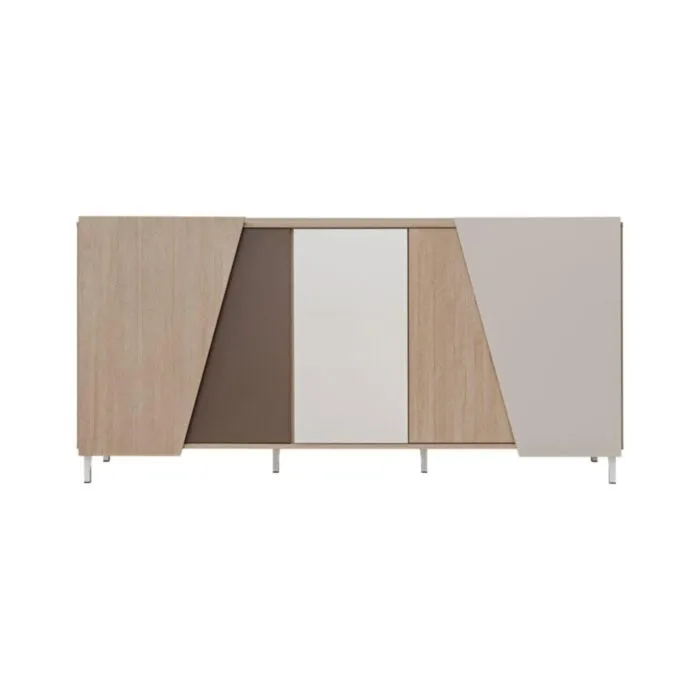 Komoda VIZIJA je moderno oblikovana in elegantnega videza, brez ročajev. V kombinaciji barv, bele, bež in rjave z lesenim delom. Izdelana v EU iz laminirane plošče debeline 16mm in ABS robovi. Nogice ima matalne, bele barve.