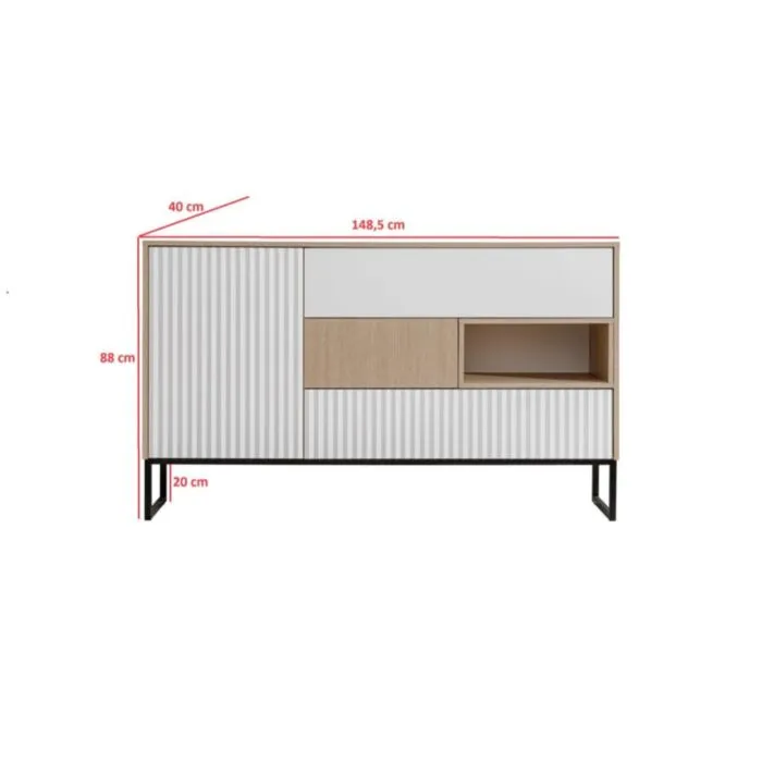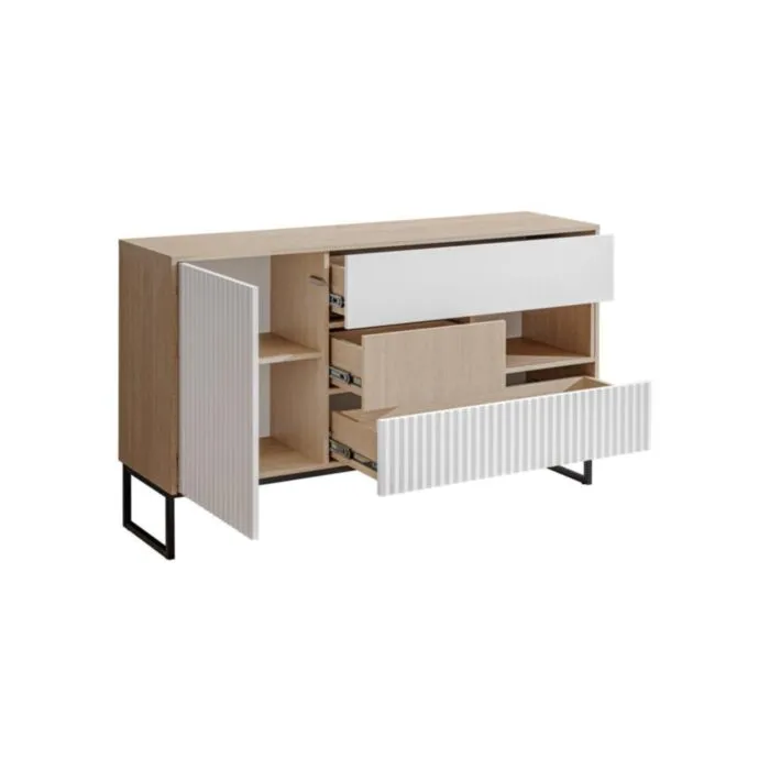 Komoda ZOELA je moderno oblikovana in elegantnega videza. Brez ročajev, odpiranje po sistemu push to open. V beli mat barvi s kombinacijo lesa. Izdelana v EU iz laminirane plošče debeline 16mm in ABS robovi. Nogice ima metalne črne barve.