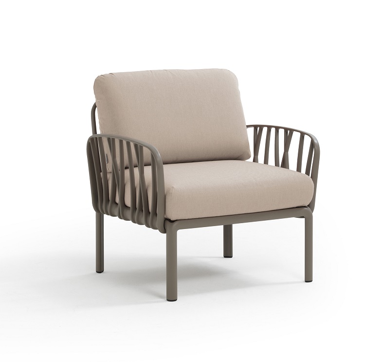 Fotej Komodo v Tortora barvi, vrhunskega italijanskega proizvajalca vrtnega pohištva NARDI. Sproščujoč fotelj primeren za zunanjo uporabo. Kvalitetni UV obstojni materiali poskrbijo za dobro in dolgo obstojnost na vremenske vplive. Fotelj je na voljo ločeno ali konfigurirano kot sestavni element večjih garnitur. Modularni sistem oblazinjenih sedežev Komodo nam omogoča neomejeno število možnosti. Fotelj je izdelan iz enakomerno obarvane polipropilenske smole iz steklenih vlaken. Površina fotelja je matirana in je prijetna na otip. Blazine so vključene v setu in imajo snemljivo prevleko. Bogata debelina blazin poskrbi za udobno sedenje. Blazine na naslonu so debeline 18cm, na sedalu pa 22cm. Možna je kombinacija različnih elementov iz serije KOMODO, tako da si lahko ustvarite poljubno sedežno garnituro.
