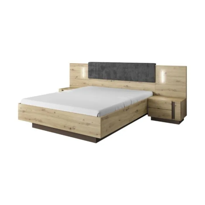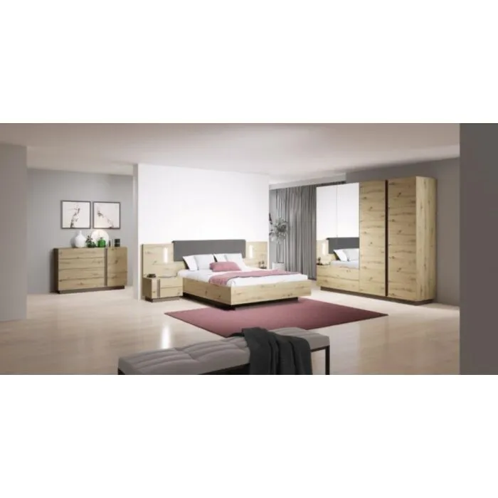 Elegantna in moderna spalnica JELENA je narejena iz odličnih materialov v grafitno sivem / hrast dekorju. Sestavljena je iz štiri delne omare, postelje z dvema nočnimima omaricama in komode. Postelja vsebuje LED razsvetljavo.