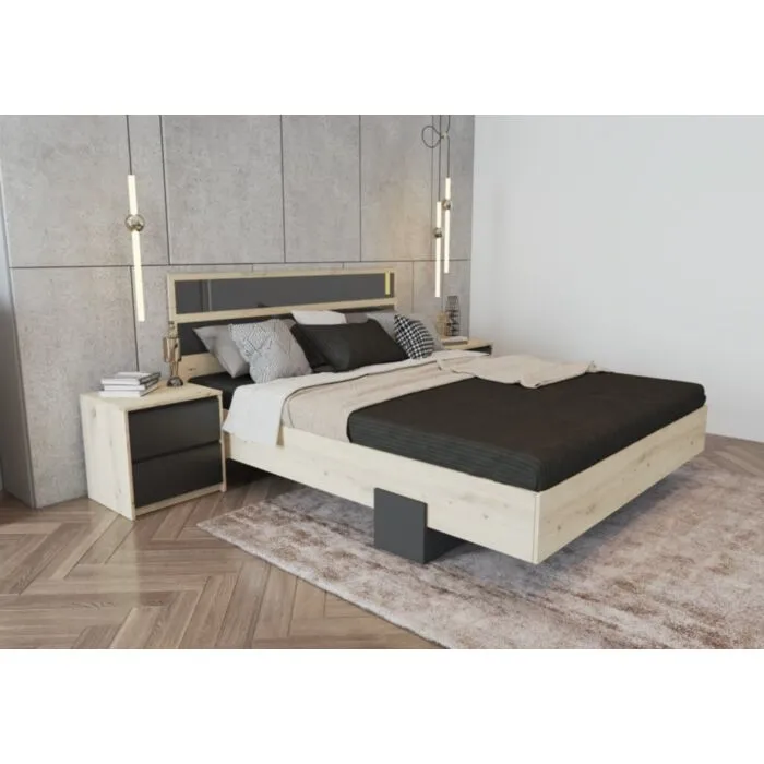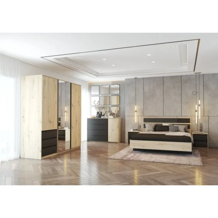 Garderobna omara ima veliko ogledalo, v notranjosti na levi strani je opremljena s tremi prostornimi predali. Pod predali ima tri prostorne črne predale za shranjevanje vseh oblačil in predmetov, ki jih želite imeti organizirane. Na sredini ima prostorne police. Na desni strani pa velik prostor za obešanje in shranjevanje vaših najljubših kosov. Nočna omarica je opremljena z dvema prostornima predaloma. Zaradi svoje barve in kompaktne dimenzije se prilega v vsak prostor. Kompletna spalnica je narejena iz kakovostne laminirane plošče debelne 16 mm. V ceno sta vključeni dve nočni omarici.