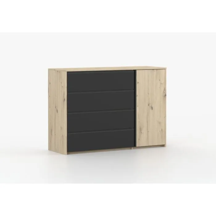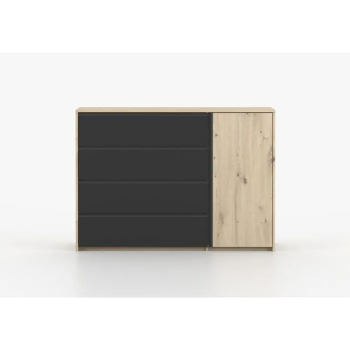 Kompletna spalnica LANZAROTE je sestavljena iz kar štirih velikih, prostornih elementov: postelje 160×200, komode, garderobne omare in dveh nočnih omaric. Postelja je moderen kos pohištva. Je odlična izbira za vsako tradicionalno ali moderno spalnico. Elegantna oblika v modnih barvah se bo odlično podala v vsak aranžma. Dodatna prednost sta trdna izdelava in udobje pri spanju. Postelja je kakovostna in trpežna. V ceno je vključen posteljni pod. Komodo lahko postavite v dnevno sobo, spalnico, hodnik ali garderobo. Opremljena je s štirimi prostornimi predali in globokimi policami.