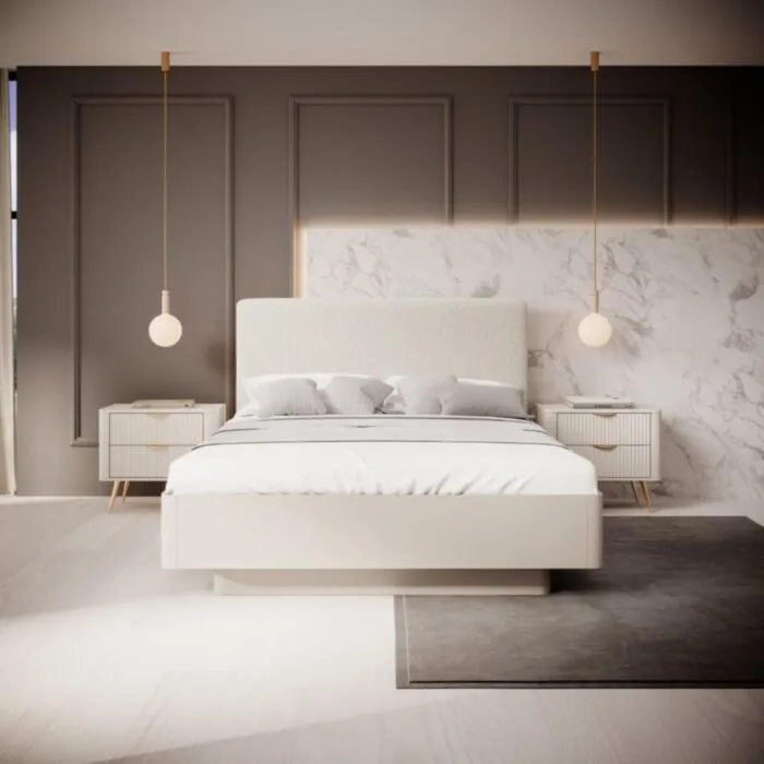 Elegantna in moderna spalnica LILJA,  je narejena iz odličnih materialov v barvi beige. Sestavljena je iz garderobne omare, komode, postelje z zabojom za shranjevanje in z dvema nočnima omaricama. V ceno je vključen dvižni pod. Narejena je iz MDF-ja in ima ABS rob. Ima kovinske ročaje in nogice v zlati barvi.