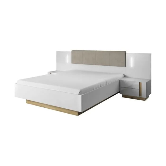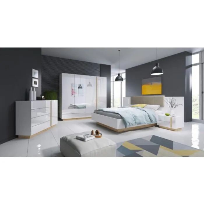 Elegantna in moderna spalnica NANCY je narejena iz odličnih materialov v bela visoki sijaj/hrast dekorju. Sestavljena je iz štiri delne omare, postelje z dvema nočnimima omaricama in komode. Postelja vsebuje LED razsvetljavo.