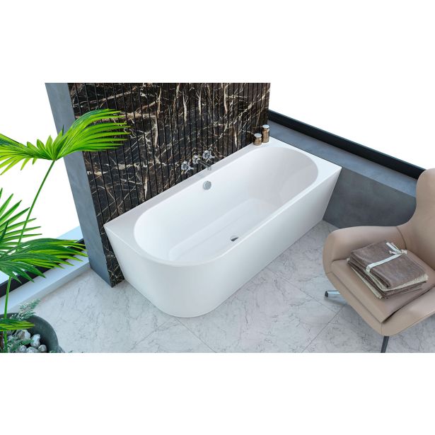 Kotna kopalna kad iz litega sanitarnega akrila z eno zunanjo stranico in klasičnimi ovalnimi linijami. Ovalna kopalna kad, za montažo ob steni, s prelivno garnituro. Kad in obloga iz enega dela.
