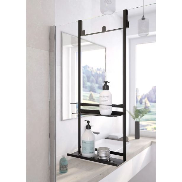 Viseča polica je idealna za odlaganje mila. Na zunanji strani pa so dodatni obešalniki za odlaganje brisač, halj,…