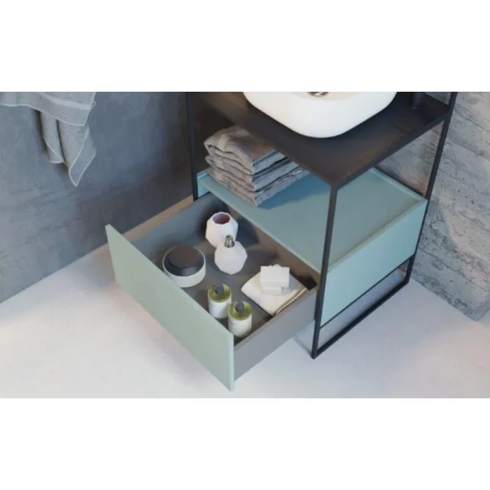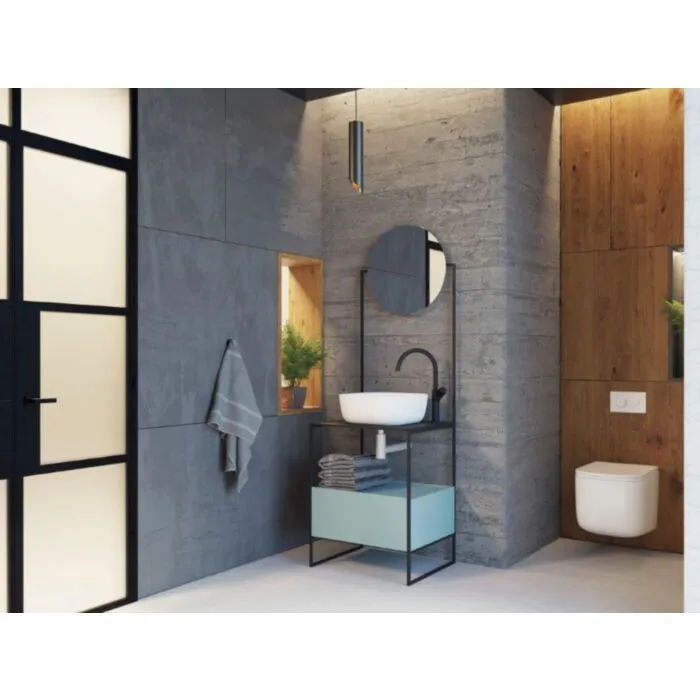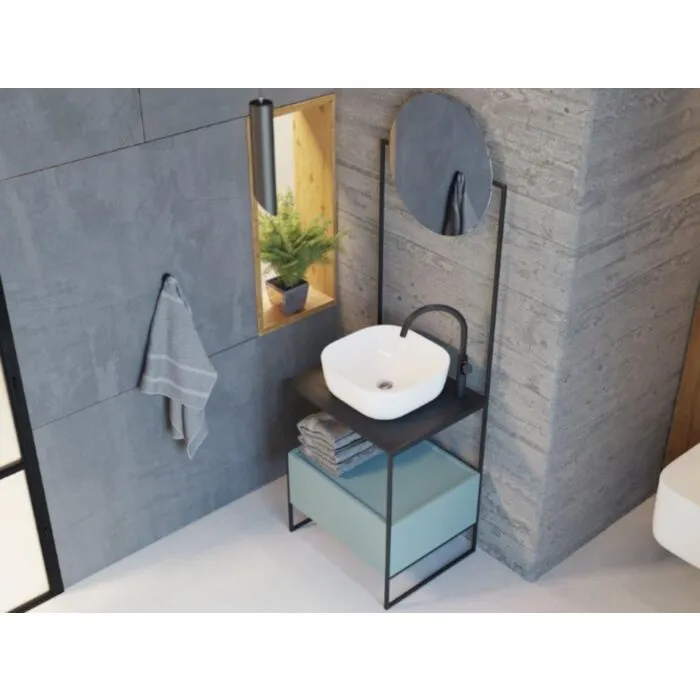 Kopalniška omarica ALAKA ima kovinsko konstrukcijo ter ogledalo. Je odlična rešitev za majhne kopalnice in ustvari dodaten dekor v kopalnici. Ima črno kovinsko ogrodje ter, korpus in fronte so pa v petrolej barvi ter barva plošče je pa grafitno siva. Vsebuje 1 predal, umivalnik ni vključen v ceno. Ima popolni izvlek predala, ki omogoča olajšano odlaganje predmetov. Zagotavlja preprosto čiščenje – material, ki je odporen proti madežem ter vlagi. Ogledalo je ključeno v konstrukcijo elementa in ima high pressure laminate.