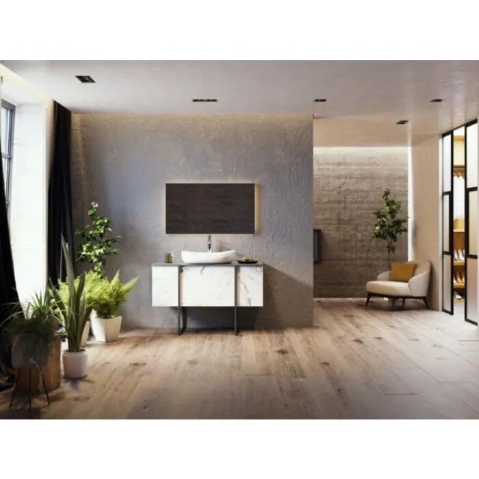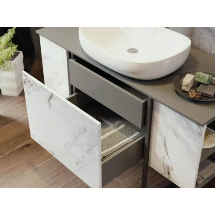 Kopalniška omarica NOLA za umivalnik, je narejena iz kvalitetnih materialov.  Je stoječi element narejen iz visokokvalitetnega laminata ter materialov odpornih proti vlagi in vsebuje poseben premaz proti vidnim prstnim odtisom, zato je čiščenje preprosto. Ima čiste linije brez ročajev, odpira se s mehanizmom push to open. Vsebuje globoki predal, ki omogoča več prostor za odlaganje. Ima kovinske nogice. Poseben je zaradi imitacije marmorja ter pridih nežne grafitno sive barve.