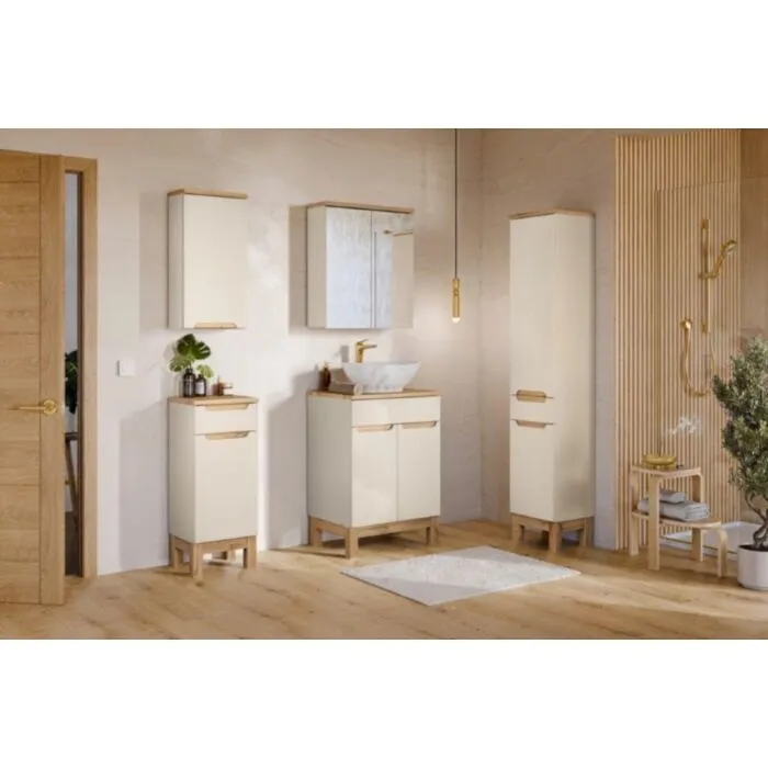 Kopalniški blok BORI 60 je hkrati enostaven in eleganten. Elementi so nežne kašmir barve v kombinaciji s hrastom, to je popolna kombinacija, ki se poda vsakemu stilu kopalniškega interierja. Izdelan je iz laminirane ter MDF plošče. Vsebuje mehko zapiranje.