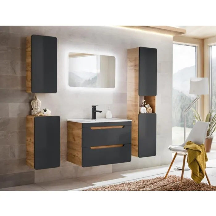 Kopalniški blok BUBA DARK 2 80 je odlične kvalitete, narejen iz kakovostnih materialov. Vsebuje LED ogledalo, umivalnik, omarico pod umivalnikom, visoko visečo omaro ter dve mali viseči omarici. Kopalniški blok ima mehko zapiranje in keramični umivalnik.