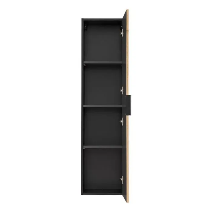 Kopalniški blok ILA 60 je izdelan v sodobnem dizajnu, ki združuje naravno lepoto hrastovega lesa s sodobno črno barvo. Osnovni element bloka je omarica za umivalnik, ki je izdelana iz kakovostne laminirane plošče s neverjetno čudovitim vzorcem lesa. Omarica je izjemno praktična in uporabna, saj ponuja veliko prostora za vso vašo kopalniško opremo. Poleg omarice za umivalnik je v kopalniškem bloku tudi visoka omarica, ki se odlično ujema z omarico za umivalnik. Visoka omara je isto izdelana iz kvalitetne laminirane plošče s kombinacijo črne barve. Ponuja veliko prostora za shranjevanje vseh brisač, kozmetike ali drugih potrebščin. Kopalniški blok vsebuje mehko zapiranje, kar zagotavlja udobno in tiho uporabo. V setu je všteto tudi ogledalo s črno obrobo, ki se odlično zlije h celotnemu setu.