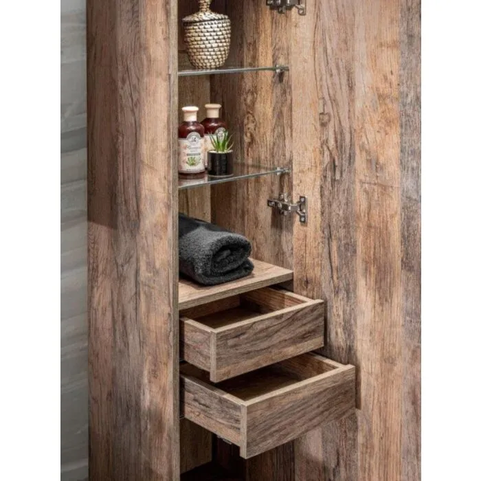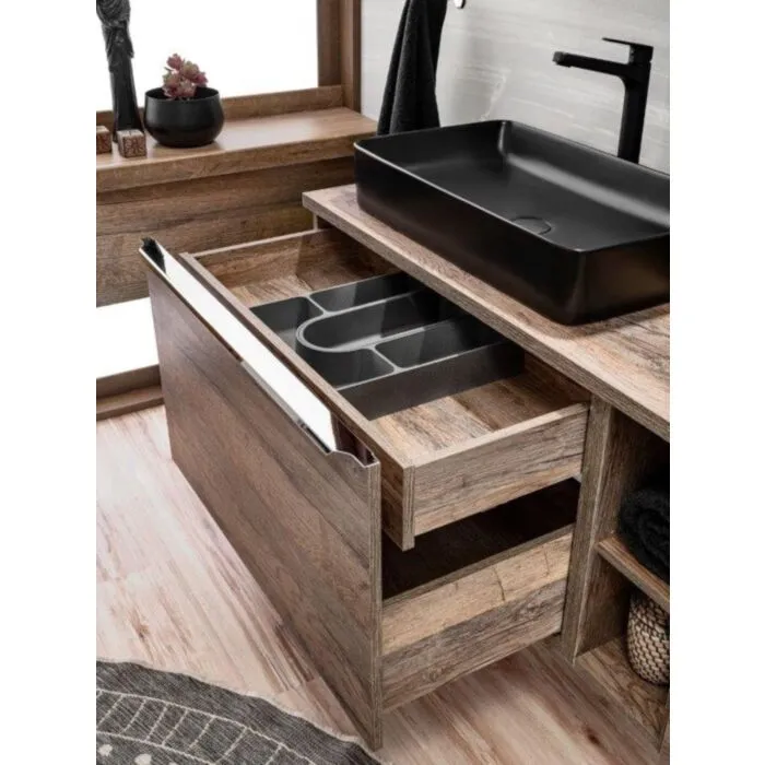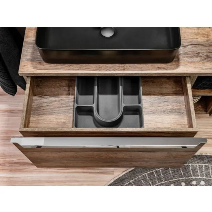 Kopalniški blok KELLY 80 2 je narejen iz kvalitetnih materialov. Stare sprednje strani in ohišje v barvi hrasta v kombinaciji s kromiranimi ročaji dajejo celotnemu kosu lahkotnost in eleganco. Omarice z ogledalom v kolekciji optično povečajo kopalnico in zagotovijo dodaten prostor za shranjevanje. V omarici izpod umivalnika imate tudi organizator predala, ki vam omogoča preglednost v predalu. Komplet vsebuje mehko zapiranje in steklene police v  visoki omari.  V ceno je vključeno 1 x omarica pod umivalniko, 1 x nadpultna plošča, 1 x omarica z ogledalom, 1 x LED lučka, 1 x visoka omara ter po želji 1 x umivalnik.