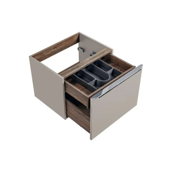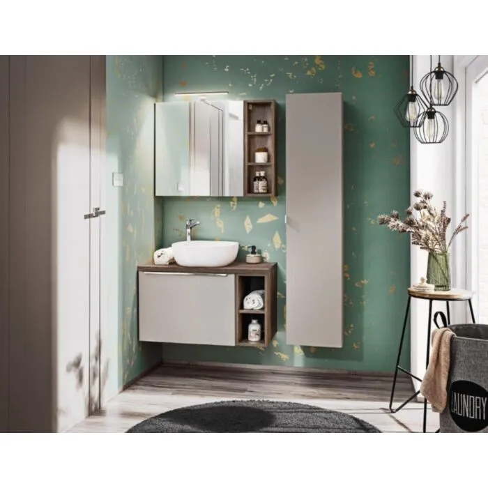 Kopalniški blok KROKI 80 je oblikovan v modernem slogu, kar vam bo omogočala da ga lahko postavite v katero koli kopalnico in bo izgledal odlično. Taupe barve sprednjih strani in ohišja v kombinaciji s kromiranimi ročaji dajejo celotno lahkotnost in eleganco. Omarica z ogledalom dodatno optično poveča prostor in ponuja vam več prostora za shranjevanje vaših stvari. Poleg dobite tudi organizator predala. Vsebuje mehko zapiranje in steklene police v visoki omari ter omarah z ogledalom. Ima kromirane ročaje. Če želite LED luči dopišete v komentar (+29€).