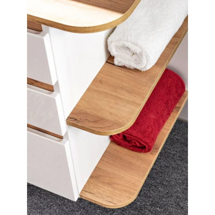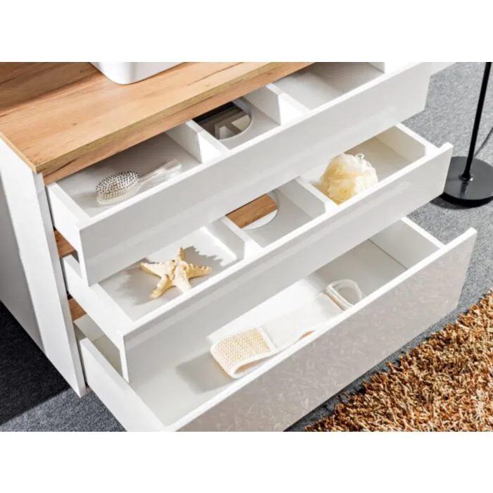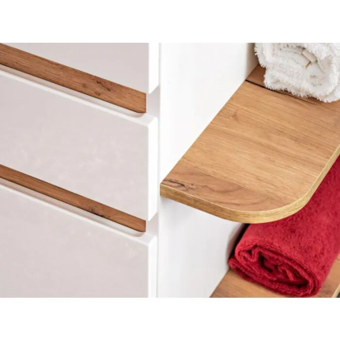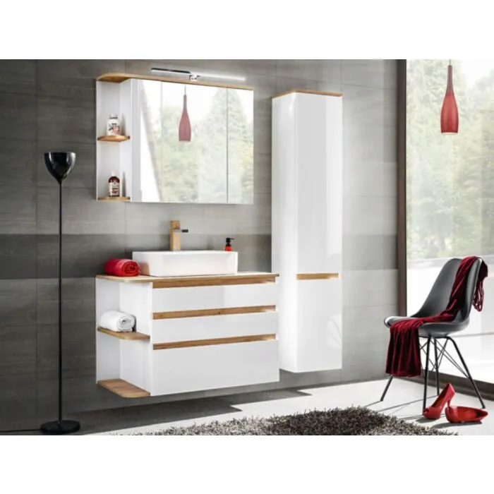 Kopalniški blok LATINA je odlične kvalitete, narejen iz kakovostnih materialov. Vsebuje ogledalo, umivalnik, omarico pod umivalnikom in visoko visečo omaro. Kopalniški blok ima mehko zapiranje in keramični umivalnik. Postavitev je lahko leva ali desna, to uredite pri sami montaži.
