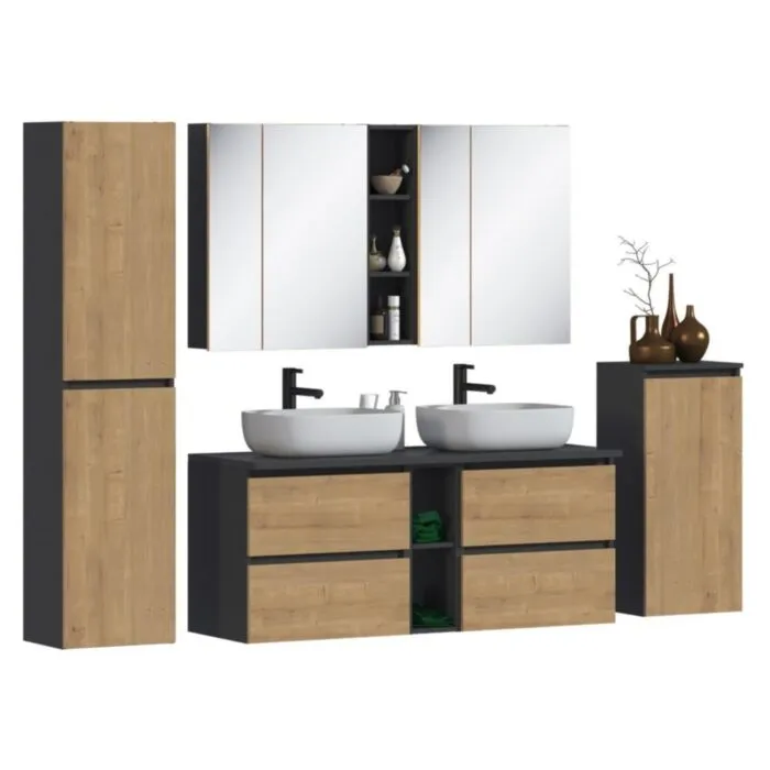 Kopalniški blok MOTO 140 DUO je odlične kvalitete, narejen iz kakovostnih materialov. V njem vam nikoli več ne bo zmanjkalo prostora, ko si boste delili kopalnico. Vsebuje dva umivalnika z omaricama pod njima in poličnikom, dve omarici z ogledali in poličnikom, visoko omaro in nizko omaro s košem za perilo. Kopalniški blok ima mehko zapiranje.