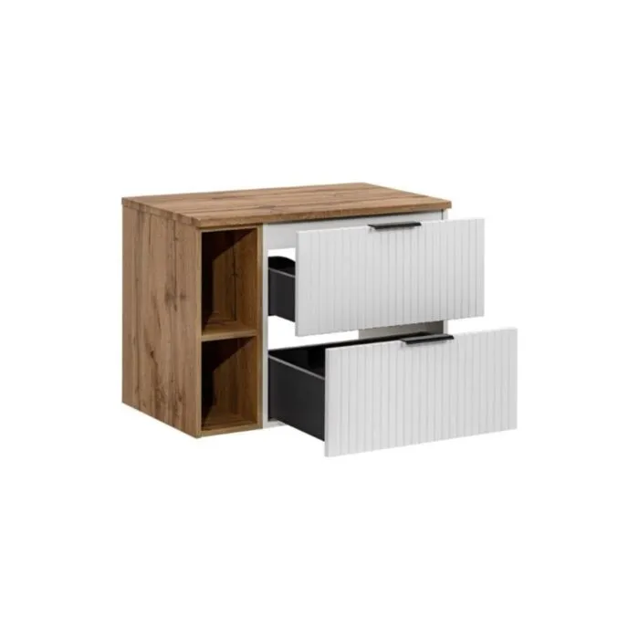 Kopalniški blok PIJA 80 2 je narejen v beli barvi, kar mu poudari čist in sodoben izgled. Je funkcionalen in estetsko privlačen set, ki ponuja veliko shranjevalnega prostora in optično poveča kopalnico. Z nadpultno ploščo v hrast barvi, smo dodali malo modernega pridiha. V ceni je všteto 1 x visoka omara, 1 x omarica pod umivalnikom, 1 x odprti poličnik, 1 x nadpultna plošča, 1 x ogledalo, 1 x LED lučka ter 1 x umivalnik po želji. Visoka omara vsebuje veliko polic notri, omarica pod umivalnikom pa dva globoka predala.
