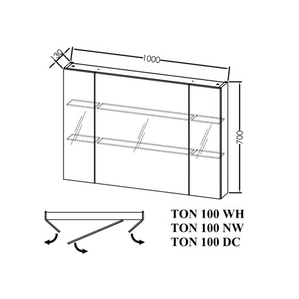 Kopalniška omarica z ogledalom Kolpa San TON 100 WH iz linije Naomi ima na sprednji strani ogledalo preko celotne površine. Notranjost je predeljena z dvema policama. Dimenzija omarice z ogledalom je 1000 x 700 x 130 mm.