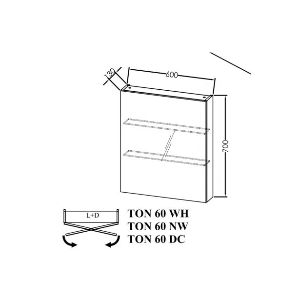 Kopalniška omarica z ogledalom Kolpa San TON 60 DC iz linije Naomi ima na sprednji strani ogledalo preko celotne površine. Notranjost je predeljena z dvema policama. Dimenzija omarice z ogledalom je 600 x 700 x 130 mm.