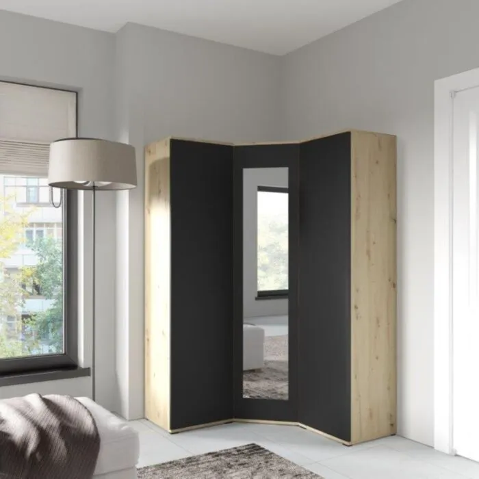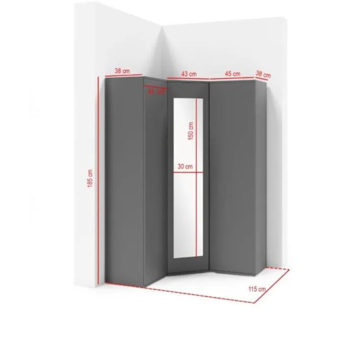 Kotna garderobna omara EMILI 2 je izvirna in stilska. Izdelana iz laminirane plošče. Na voljo v več barvah. Garderobna omara je opremljena z ogledalom.