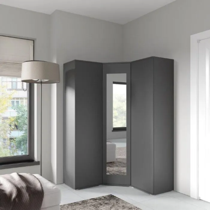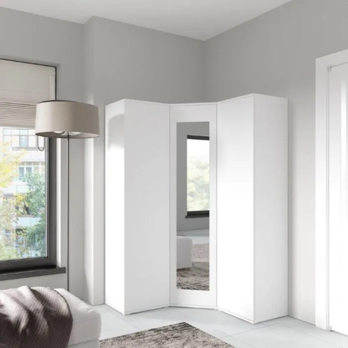 Kotna garderobna omara EMILI je izvirna in stilska. Izdelana iz laminirane plošče. Na voljo v več barvah. Garderobna omara je opremljena z ogledalom.