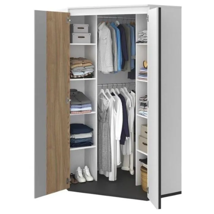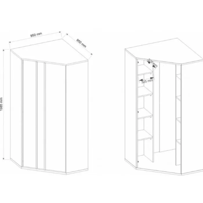 Kotna garderobna omara MELI je stilsko moderna, a hkrati praktična omara. Vsebuje police ter obešalno palico. Zaradi kotne postavitve učinkovito izkoristi prostor in se lepo poda v različne prostore.