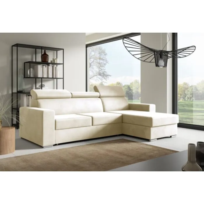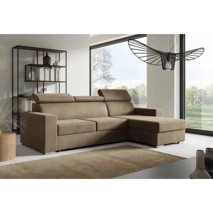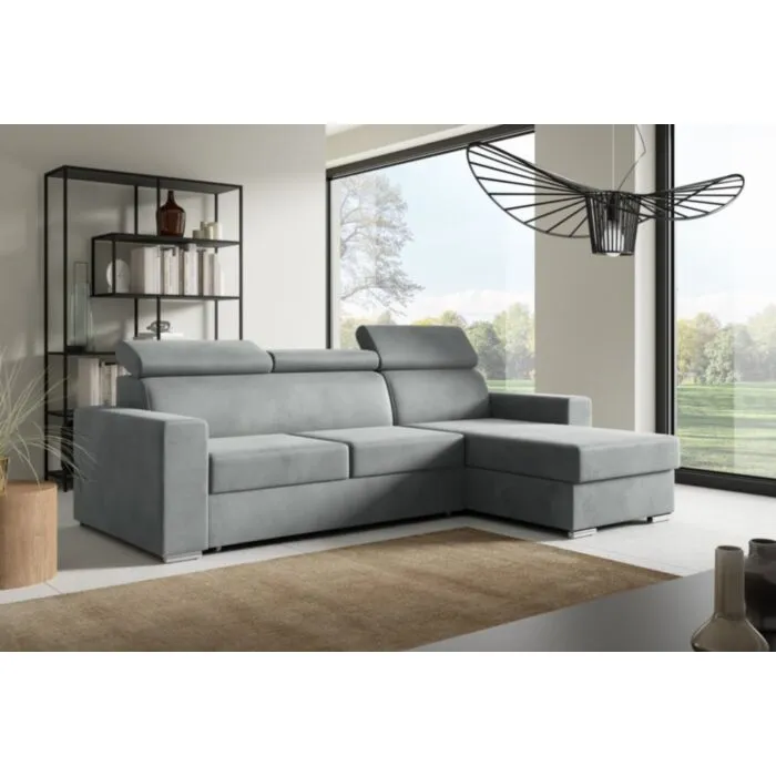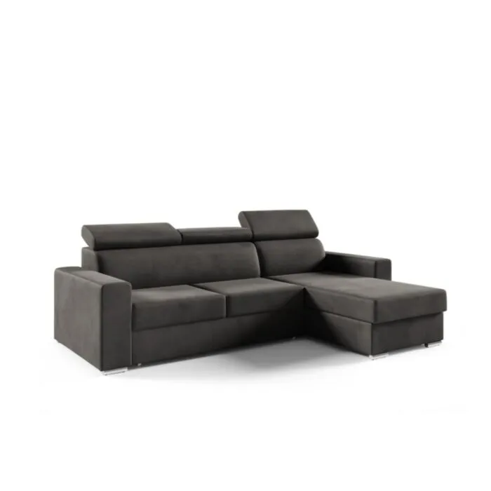 Kotna sedežna garnitura ADELINA je moderna, atraktivna in elegantna garnitura, primerna za vsak dnevni prostor. Narejena je iz kvalitetnih materialov in privlačnih barv. Primerna je za vsak prostor. Sedežni je potrebno določiti levi ali desni kot. Prednost je tudi spalna funkcija, katera se raztegne z dolphin mehanizmom. Sedež je izdelan iz valovite vzmeti in kombinacije visoko elastične pene, ki bo zagotovo pripomogla k udobnemu počitku. Njena prednost je, da ima funkcionalen predal za shranjevanje različnih stvari. Kotna sedežna garnitura ima nastavljivo vzglavje, kar pripomore k njeni funkcionalnosti.