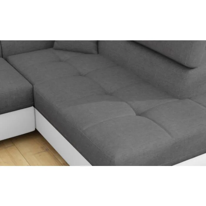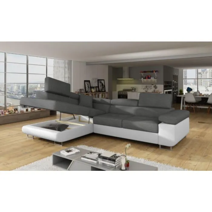 Kotna garnitura ANTON 2 je kotna sedežna garnitura, katera je narejena iz umetnega usnja in blaga. Garnitura se raztegne v ležišče ima zaboj za posteljnino in nastavljive tri vzglavnike. Garnituri pripada tudi ena okrasna blazina. Nogice sedežne so kromirane, sedežna je vzmetena. Garnitura ima levi ali desni kot, katerega morate izbrati. Moderne linije vas bodo prepričale.