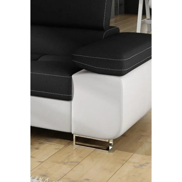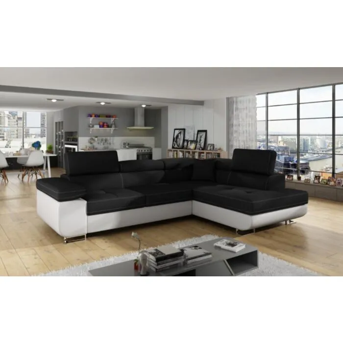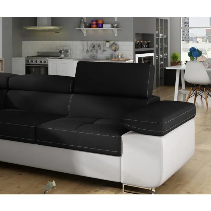 Kotna garnitura ANTON 4 je kotna sedežna garnitura, katera je narejena iz umetnega usnja in blaga. Garnitura se raztegne v ležišče ima zaboj za posteljnino in nastavljive tri vzglavnike. Garnituri pripada tudi ena okrasna blazina. Nogice sedežne so kromirane, sedežna je vzmetena. Garnitura ima levi ali desni kot, katerega morate izbrati. Moderne linije vas bodo prepričale.