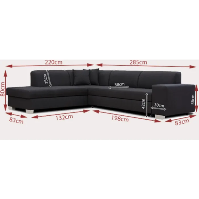 – D: 285 cm x G: 220 cm x V: 80 cm