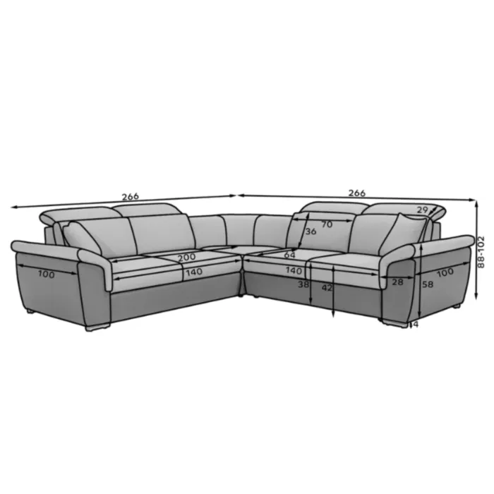 – D: 266 cm x G: 266 cm x V: 88 / 102 cm