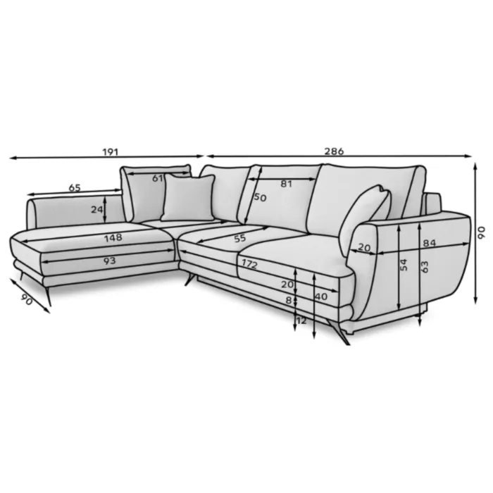– D: 286 cm x G: 191 cm x V: 90 cm