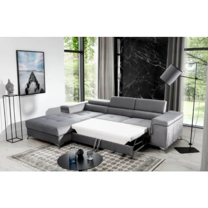 Kotna garnitura HELENA siva vas bo prepričala s svojimi modernimi linijami. Garnitura je vzmetena z valovitimi vzmetmi v kombinaciji s peno. Sedežna je udobna ter praktična za uporabo, saj se raztegne v dodatno ležišče z delfin mehanizmom. Sedežna vsebuje zaboj za shranjevanje posteljnine in ima nastavljive vzglavnike.