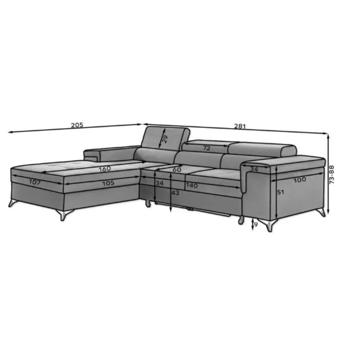 – D: 281 cm x G: 205 cm x V: 88 cm