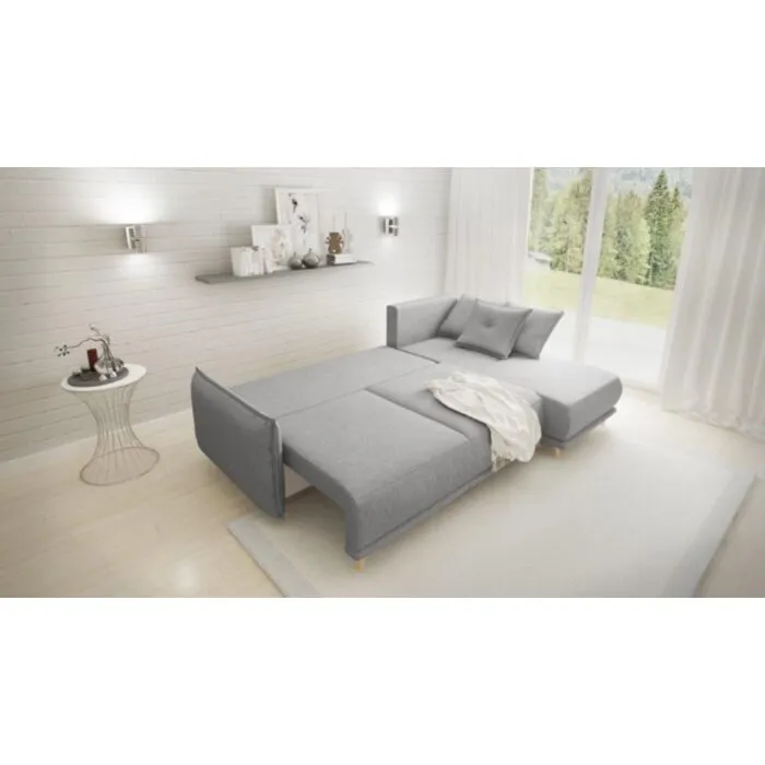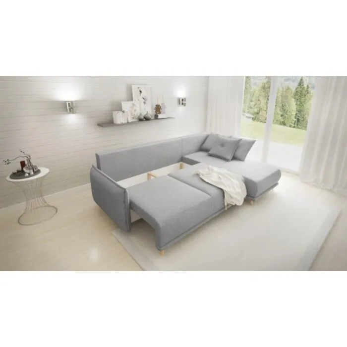 Kotna sedežna garnitura KAJA 1 je odlična garnitura po odlični ceni. Sedežna se raztegne v dodatno ležišče. Garnitura ima univerzalni kot, jo lahko postavite levo ali deno. Sedežna je vzmetena z valovitimi vzmetmi. Narejena je iz visoko elastične poliuretanske pene. Okvir je iz masivnega lesa, iverne plošče, HDF in MDF.