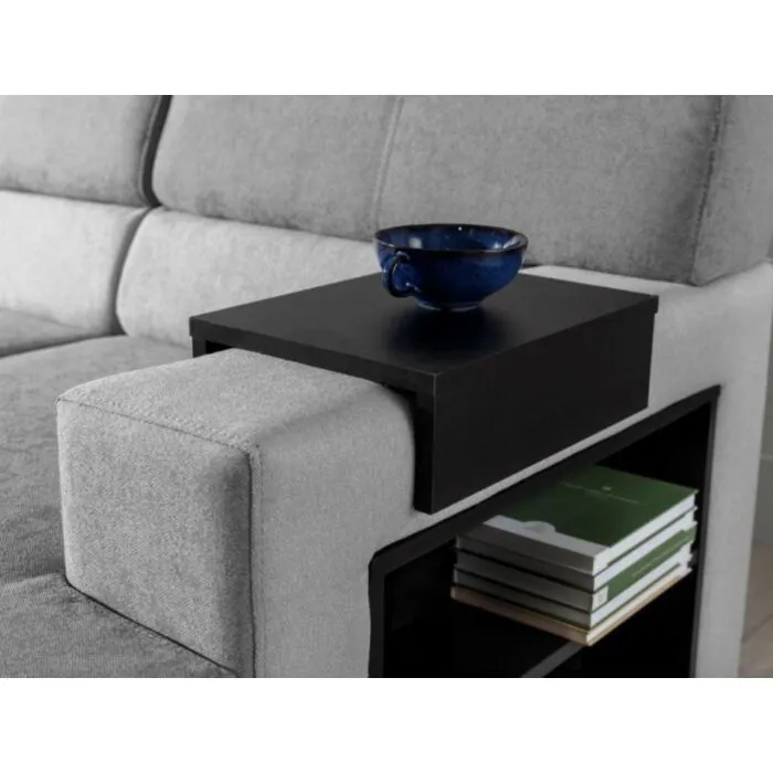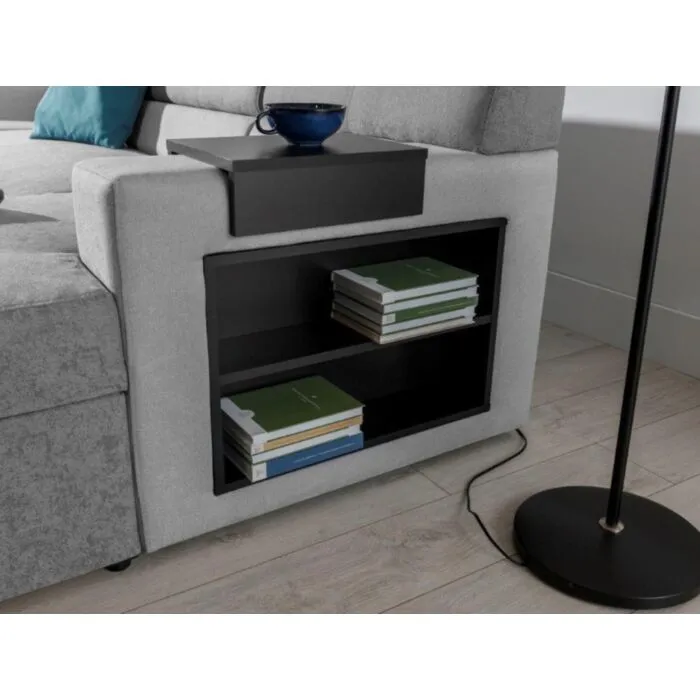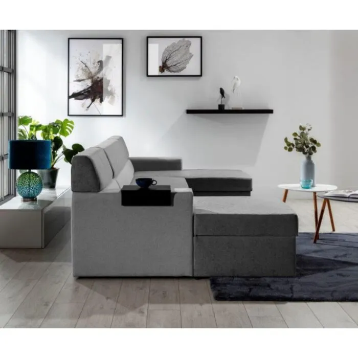 Kotna sedežna garnitura MARCO 2 je prostorna ter praktična. Vsebuje dva zaboja za shranjevanje ter poličke. Sedežna se raztegne v ležišče z delfin mehanizmom. Vzmetena je z valovitimi vzmetmi.