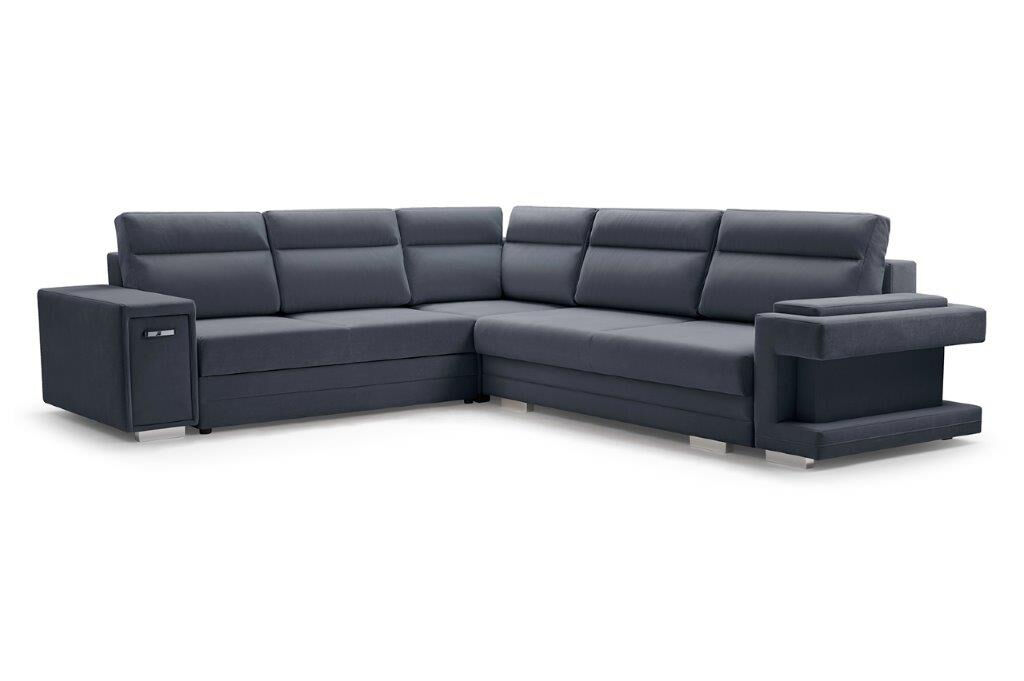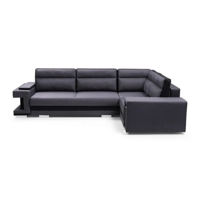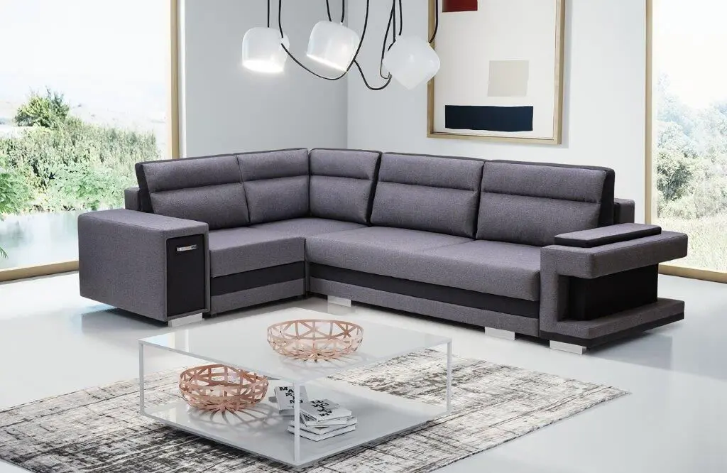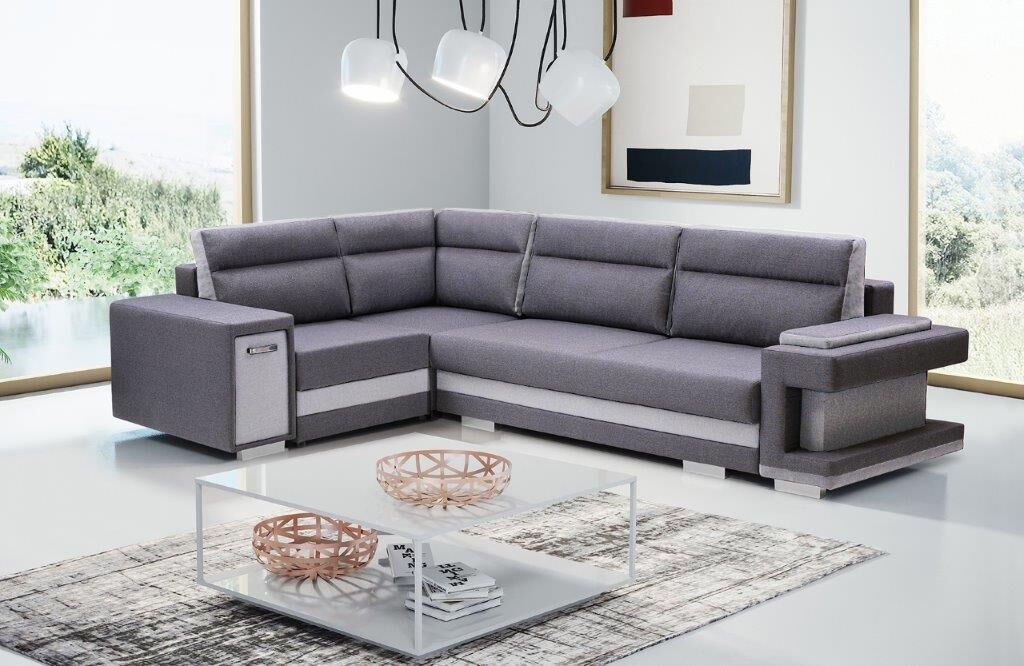 Kotna sedežna garnitura PERCIVAL je moderna in funkcionalna. Raztegne se v ležišče ter vsebuje veliko prostora za shranjevanje. Ima dva zaboja za shranjevanje ter dva predala, pod vsakim rokonaslonom. Vzmetena je z valovitimi vzmetmi.