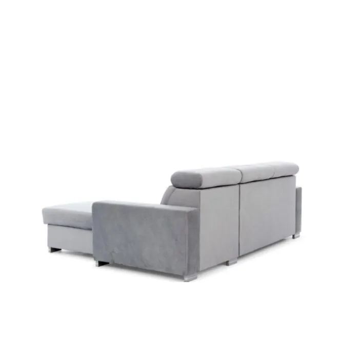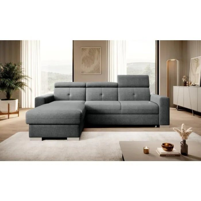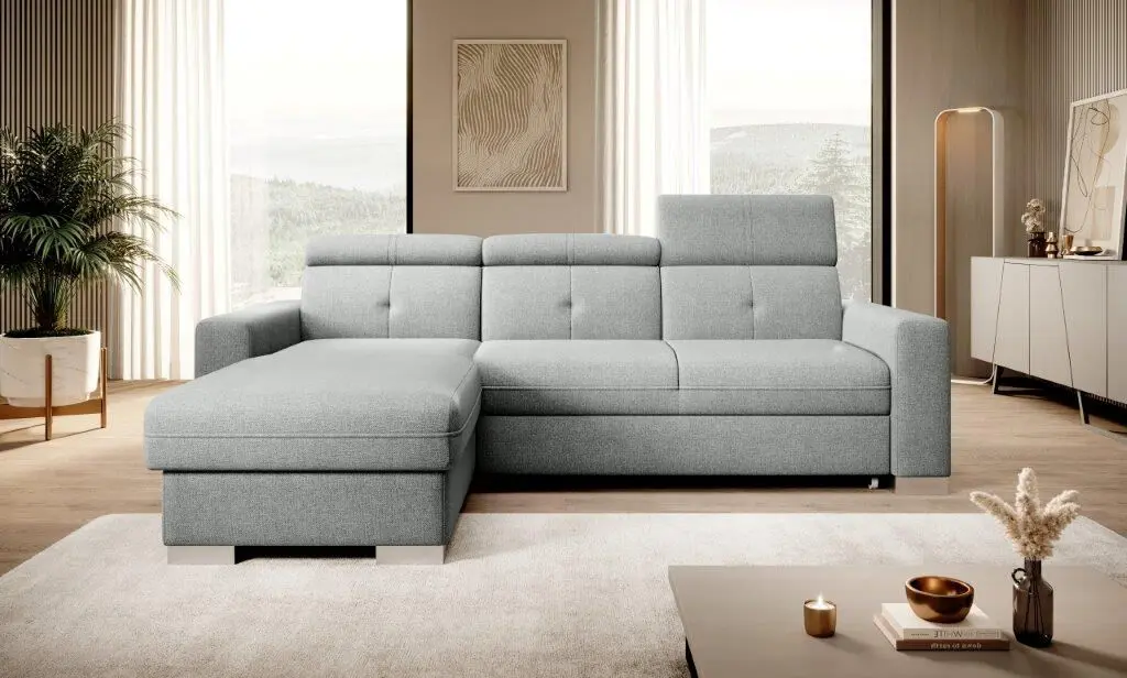 Kotna sedežna garnitura RESIA je funkcionalna in udobna. Ima nastavljive vzglavnike ter zaboj za shranjevanje posteljnine. Polnjena je s peno ter vzmetena z valovitimi vzmetmi. Sedežna se raztegne v dodatno ležišče z mehanizmom delfin.