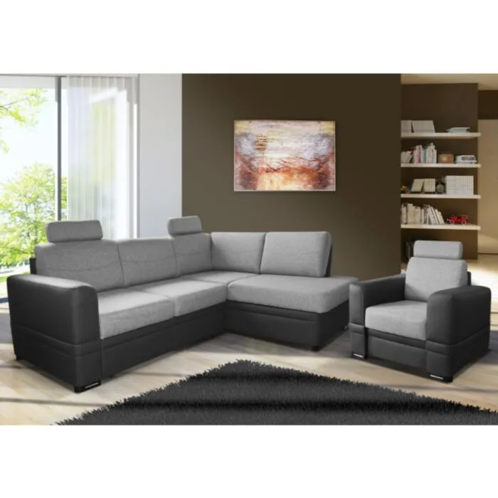 Kotna garnitura RINOS je kotna sedežna garnitura, katera je narejena iz umetnega usnja in blaga. Garnitura se raztegne v ležišče in ima zaboj za posteljino. Sedežna je vzmetena. Garnitura na sliki je levi kot. Vsebuje vzglavnike. Dizajn, kateri vas bo prepričal.