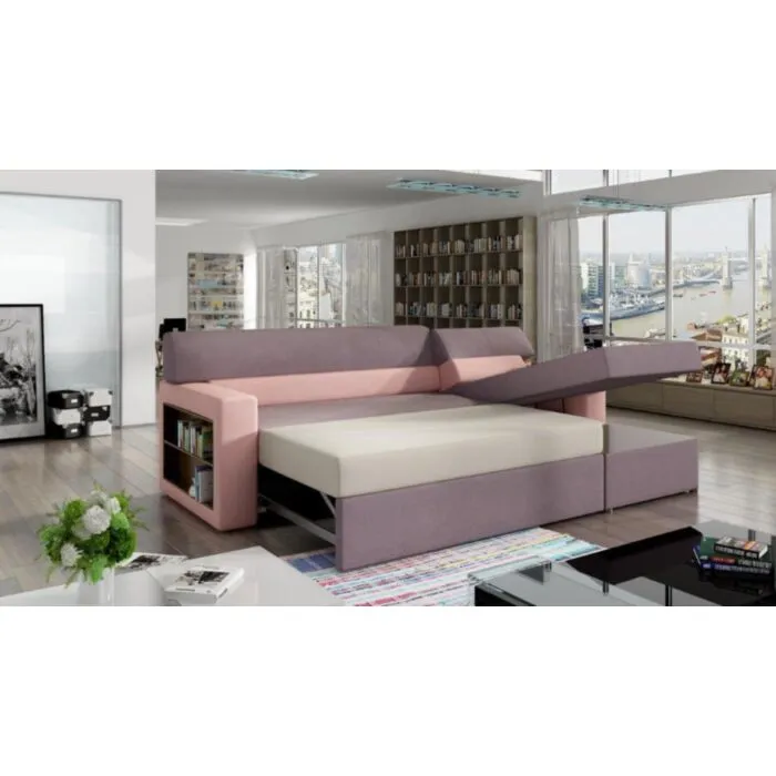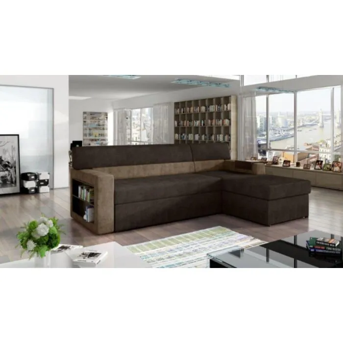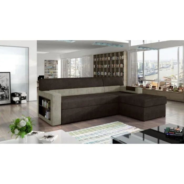 Kotna sedežna garnitura RIO 2 je odlična garnitura po odlični ceni. Izdelana je iz kakovostne tkanine. Sedežna je vzmetena z valovitimi vzmetmi. Sedežna je udobna saj se raztegne v dodadtno ležišče z delfin mehanizmom. Praktična je za uporabo saj vsebuje zaboj za shranjevanje kakor tudi poličke v rokonaslonu.